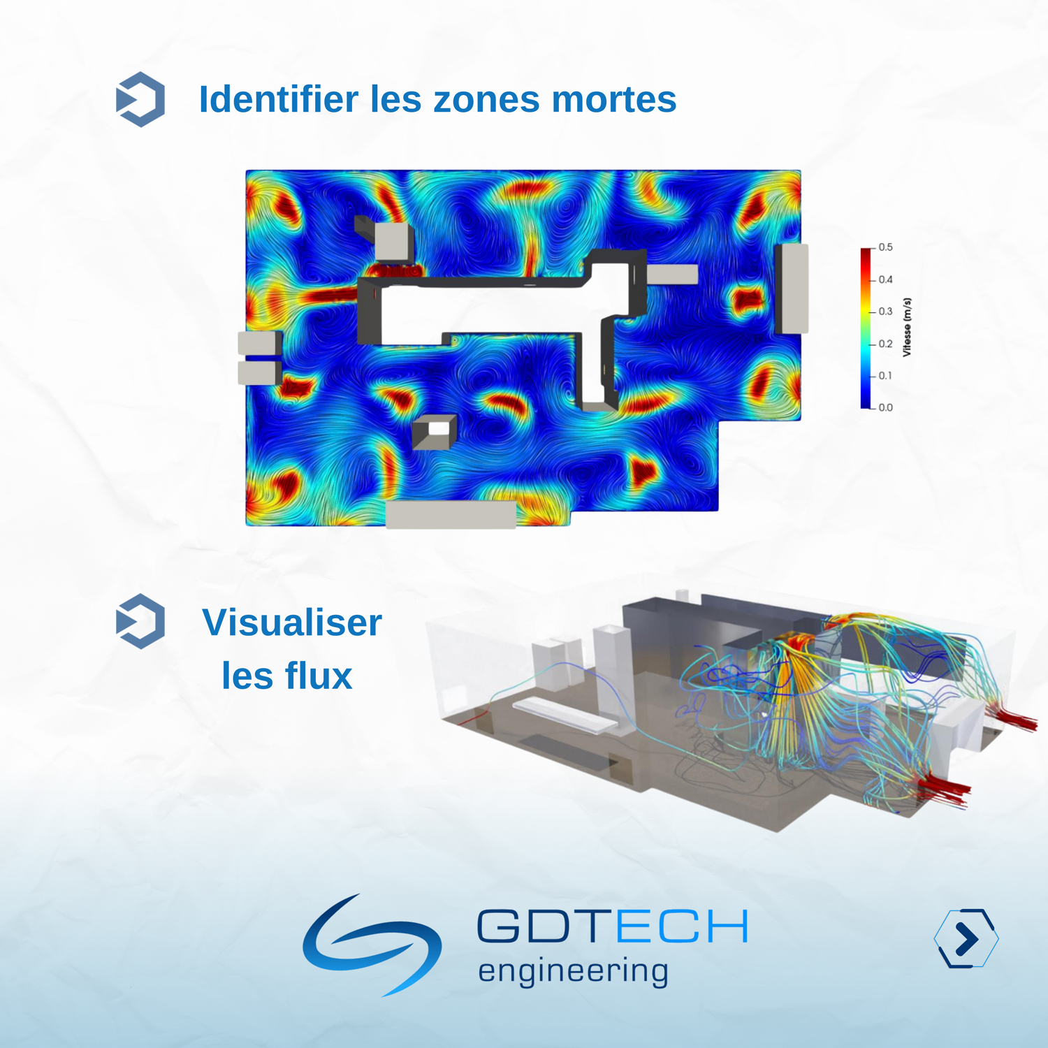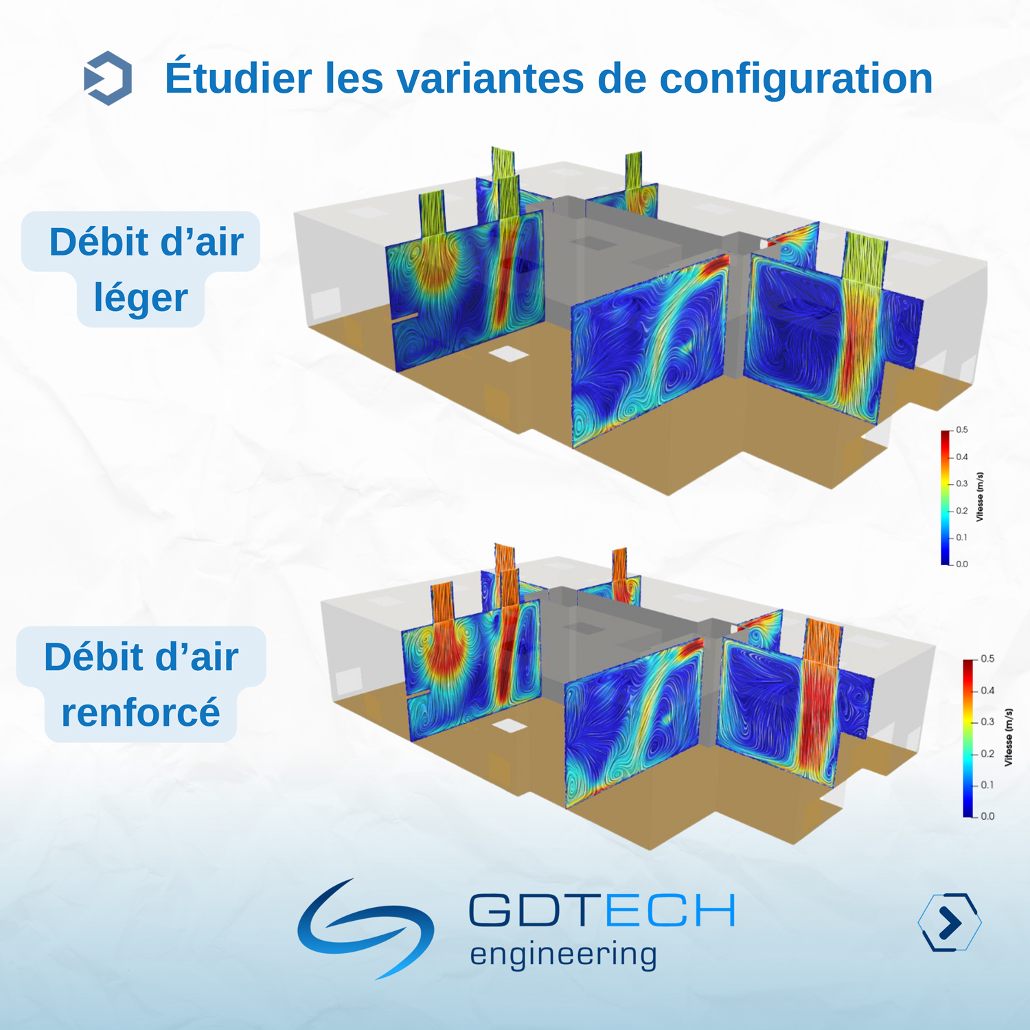 The construction of a controlled atmosphere room (CAR) requires ensuring proper airflow distribution. Numerical simulation (CFD) can be used to optimize ventilation systems, verify their performance prior to manufacturing, and identify potential stagnation zones (dead zones), air velocities, and air flow directions. These simulations are also valuable for anticipating smoke tests performed during facility qualifications.
